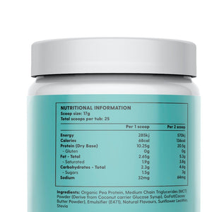 Organic Pea Protein, MCT from coconut, goFAT (Cacao butter powder), Sunflower lecithin, Natural flavours, Stevia.